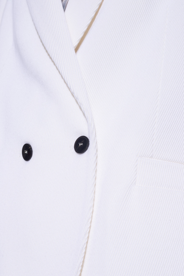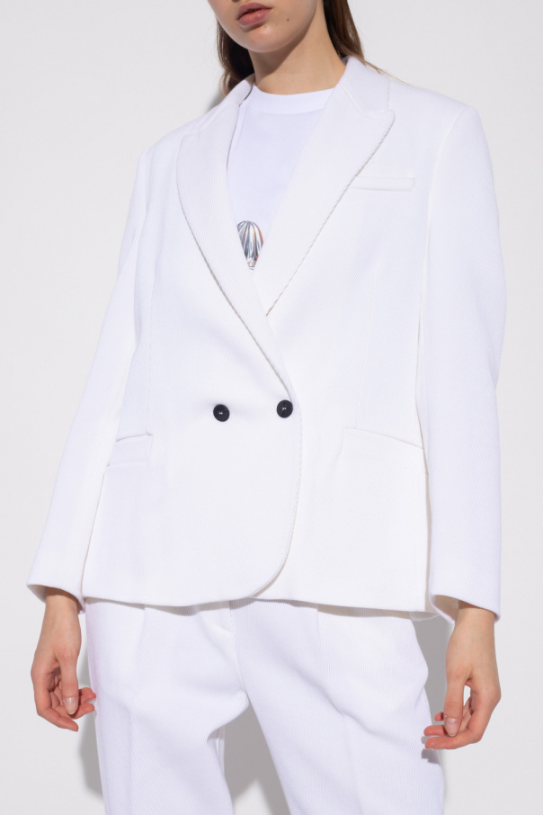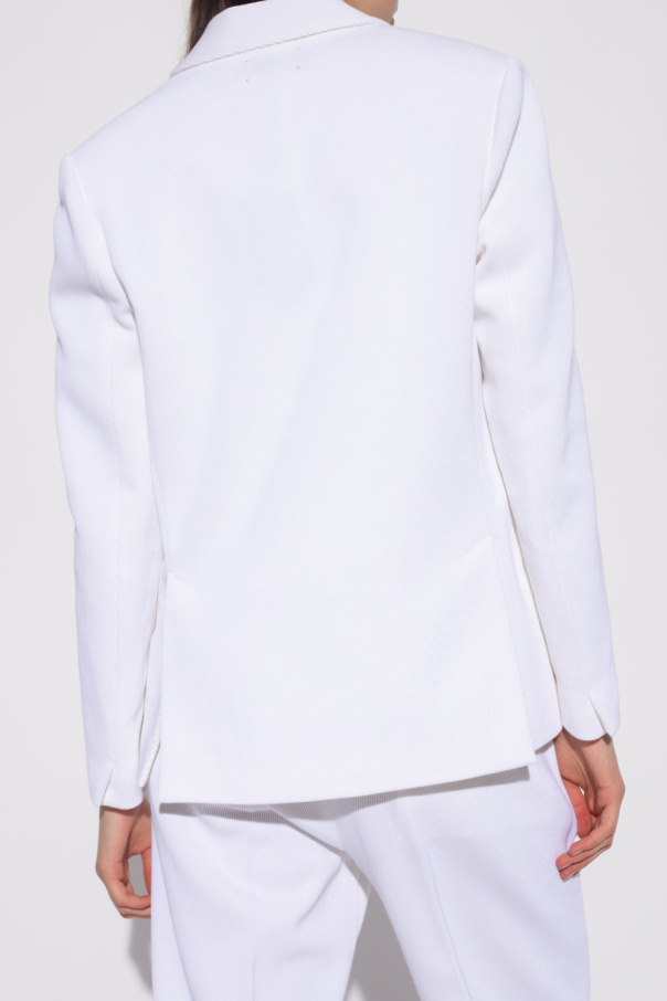 White blazer from Forte Forte. Crafted from a cotton and wool blend with a ribbed structure, this style features a double-breasted silhouette, button fastenings, two slip pockets, one decorative pocket, peak lapels and long sleeves with slits.