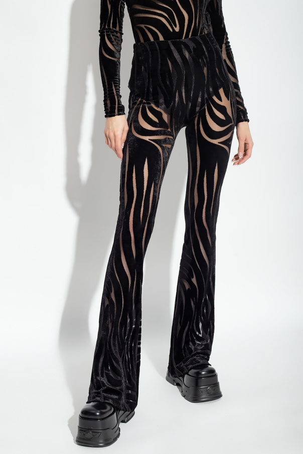 Black trousers with a velvet trim from Versace. Crafted with a transparent finish, this pair falls with flared legs and features an elasticated waistband and an animal motif.