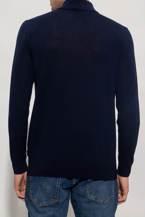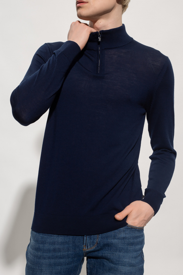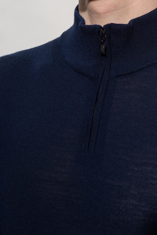 Navy blue sweater with a standing collar from Emporio Armani. Made of wool, this style features a quarter zip closure, a black logo tag on the side and elasticized trims on the edges.
