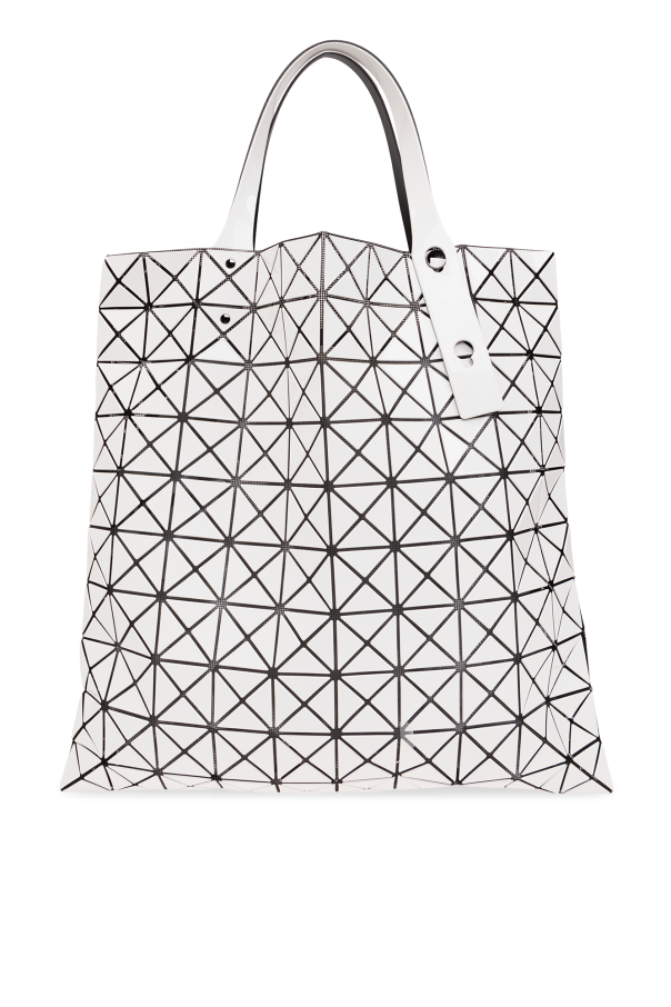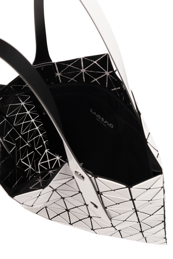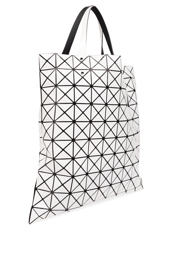 White and black ‘Prism’ shopper bag from Issey Miyake Bao Bao. Made from black material covered with a series of rubber applications creating a shiny, geometrical pattern, this design features two half-round handles and one internal compartment with a zip pocket.