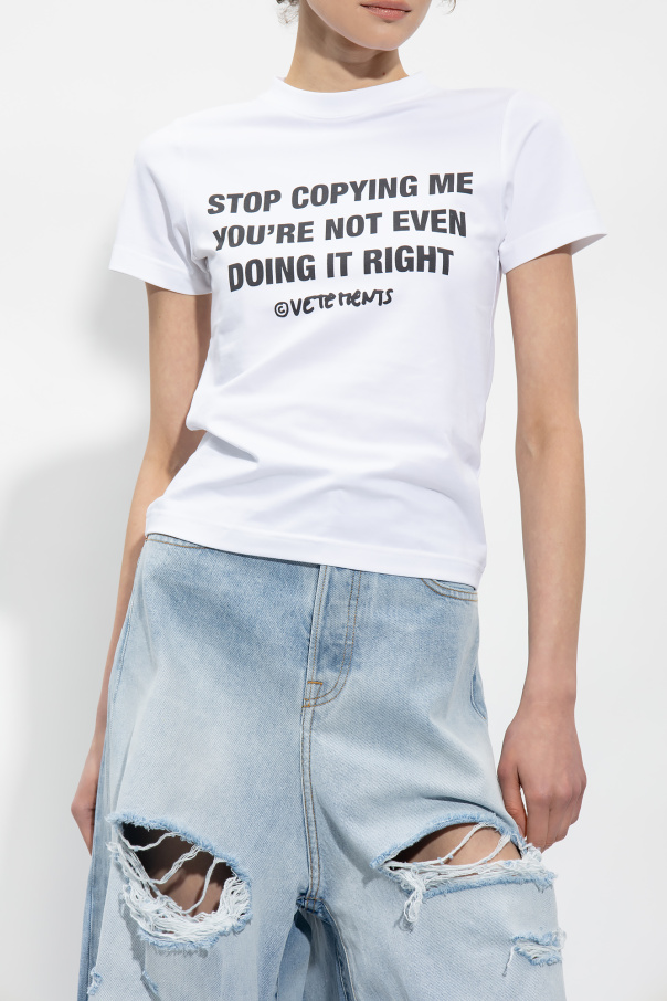 White crewneck T-shirt from VETEMENTS. Made of cotton, this style features a black logo print, short sleeves and ribbing on the collar.