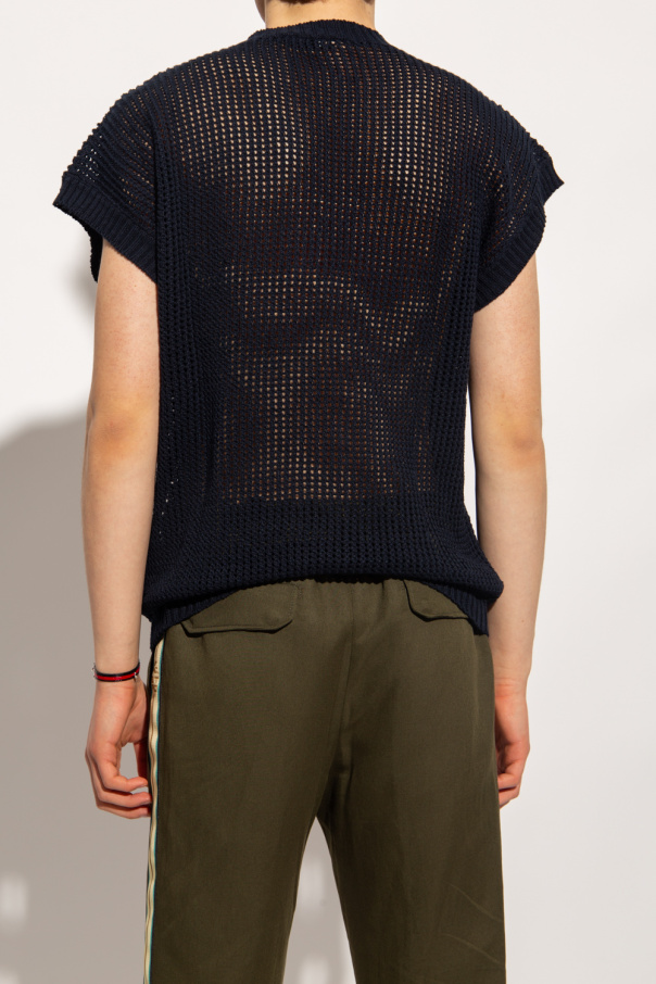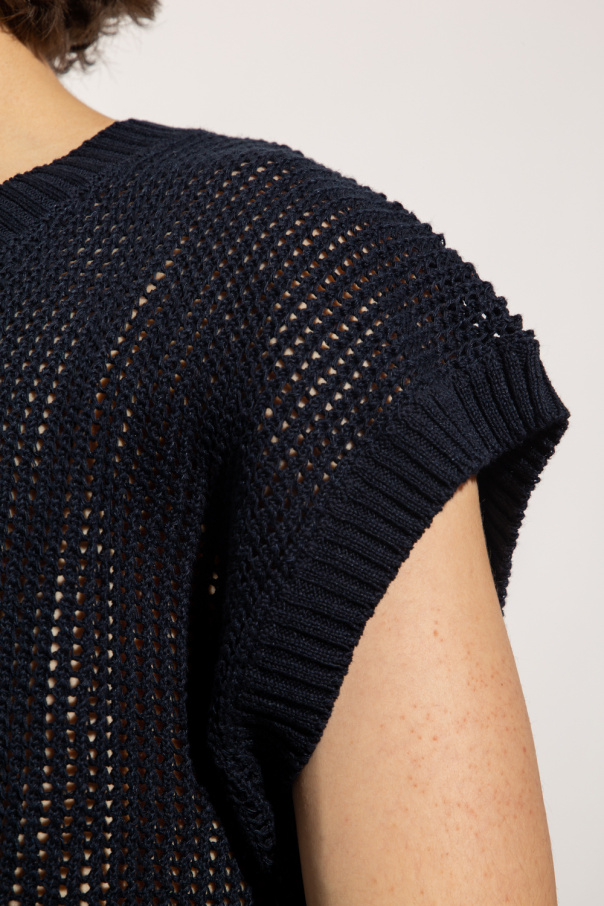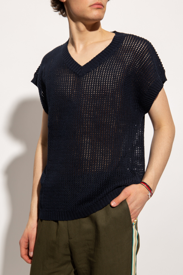 Navy vest from Etro. Knitted from a cotton and linen blend, this garment features ribbed trims at the V-neck, hem and cuffs.