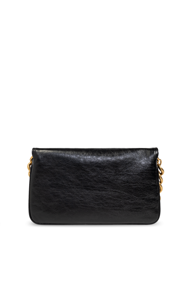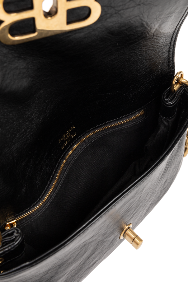 Introducing the epitome of elegance and sophistication: the Small BB Soft Shoulder Bag from the exclusive collection by Balenciaga. Crafted with meticulous attention to detail, this exquisite piece is fashioned from premium calfskin leather, offering a luxuriously smooth texture that is both visually appealing and durable. The bag\'s austere black hue exudes timeless chic, while its flat silhouette epitomizes minimalist design. The focal point, a resplendent gold \'BB\' logo, serves not only as a captivating decorative element but also as the bag\'s closure, marrying functionality with high fashion. Enhanced by a substantial, gold chain strap, this accessory transitions seamlessly from a shoulder to a crossbody bag, courtesy of the opulent gold hardware that adorns its sides. The absence of embellishments on the rear underscores the bag\'s elegant simplicity. Internally, the bag reveals a compartment lined in a lighter shade, ensuring your essentials are enveloped in luxury. Security is paramount, with a golden zipper closure inside to safeguard your belongings. This impeccably designed piece is a testament to Balenciaga\'s commitment to luxury, quality, and style. Why Purchase This Product? Made from 100% high-quality calfskin leather for durability and elegance. Iconic gold \'BB\' logo and hardware add a touch of sophistication. Versatile carrying options thanks to the detachable gold chain strap. Minimalist design with functional interior compartment and secure zipper closure. Exemplifies Balenciaga\'s luxurious craftsmanship and attention to detail.
