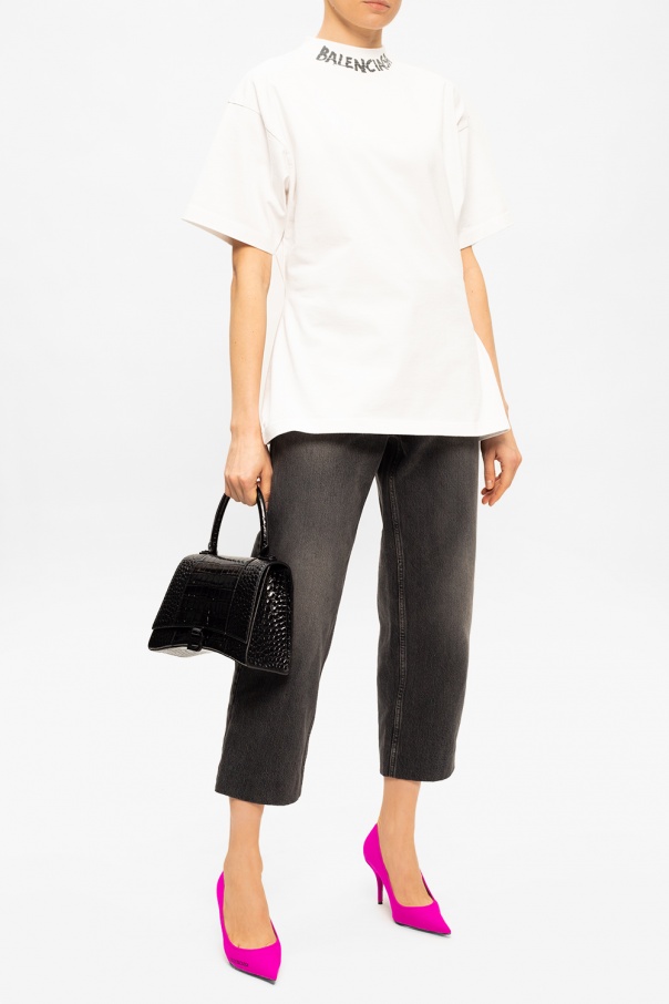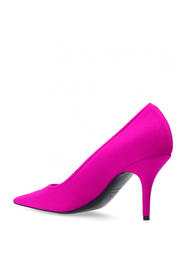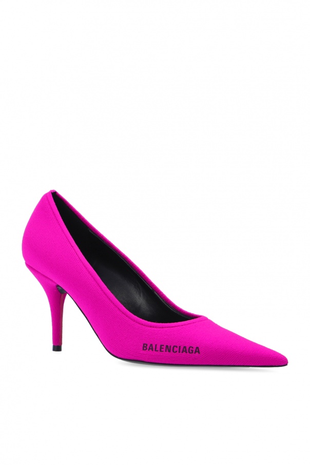 Neon pink stiletto pumps from Balenciaga. This pair features a black logo print and black rubber sole.