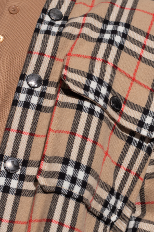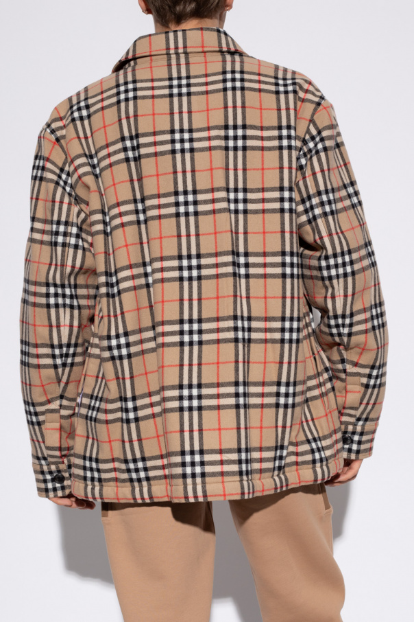 Beige jacket from Burberry. Crafted from a wool and cotton blend, this long sleeve design fastens with snaps and features the iconic multicolored check and four snap-fastened pockets, including two with flaps.