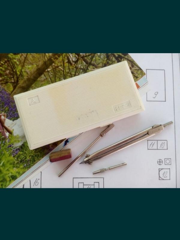 Радянський оригінальний набір креслярський НЧ-7-11 СРСР в пластиковій коробці, виробництва заводу креслярського приладдя "Рильськ" (МИНПРИБОР). Коробка на замочку-засувці, працює, розмір: 16, 5 х 7,5 див. Маркований - клеймо заводу-виготовлювача і знак якості СРСР. Всі предмети сталеві, в наявності ті, що на фото, решта - втрачені.
