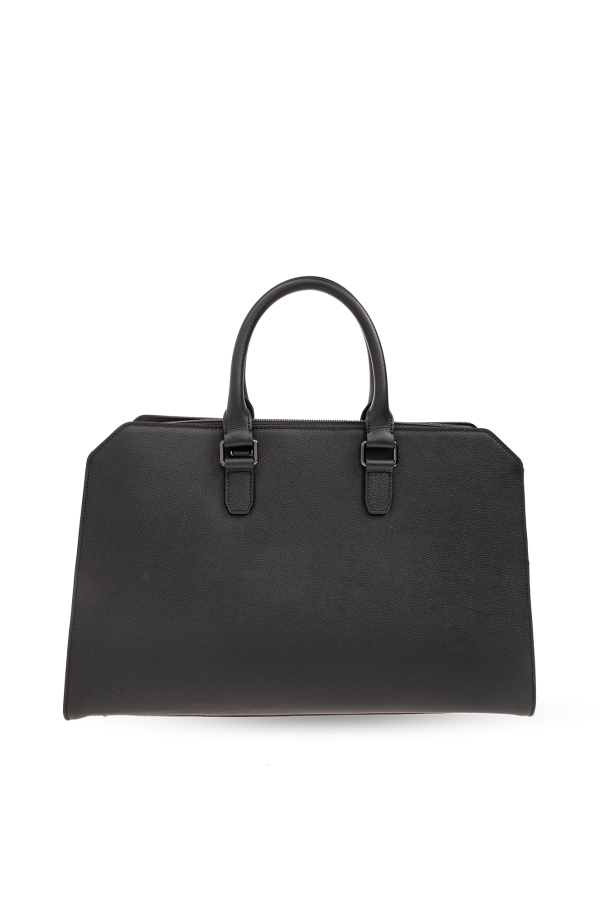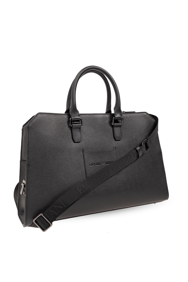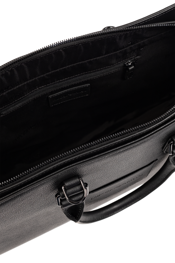 Black briefcase from Emporio Armani. Made of grained bovine leather, this item features a zip with a lock, embossed logo, card slot on the front, two half-round handles, detachable and adjustable shoulder strap, dark silver-tone metal hardware and one internal compartment with a laptop pocket and one zip pocket.