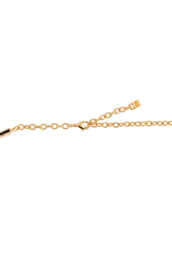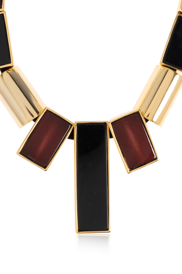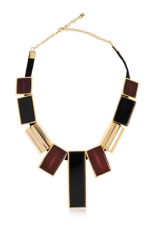 Introducing the Geometric Resin Stone Necklace by the visionary brand Dsquared2. This statement piece, crafted to perfection, epitomizes the blend of American glamour with Italian sophistication. The necklace showcases an exquisite geometric pattern of alternating black and burgundy resin stones, interspersed with lustrous gold segments. The shimmering resin offers a depth of color, while the metallic gold elements exude elegance. Anchored on a refined adjustable gold chain, it features a convenient lobster clasp closure, allowing for a personalized fit. The dominant hues of black, burgundy, and gold make this necklace a bold, luxurious accessory, perfect for elevating any elegant ensemble. Why Choose This Product? Distinctive geometric design with vibrant resin stones. Adjustable gold chain for customizable length. Crafted by renowned designers Dan and Dean Caten. Embodies the unique Dsquared2 blend of casual elegance and haute couture artistry.