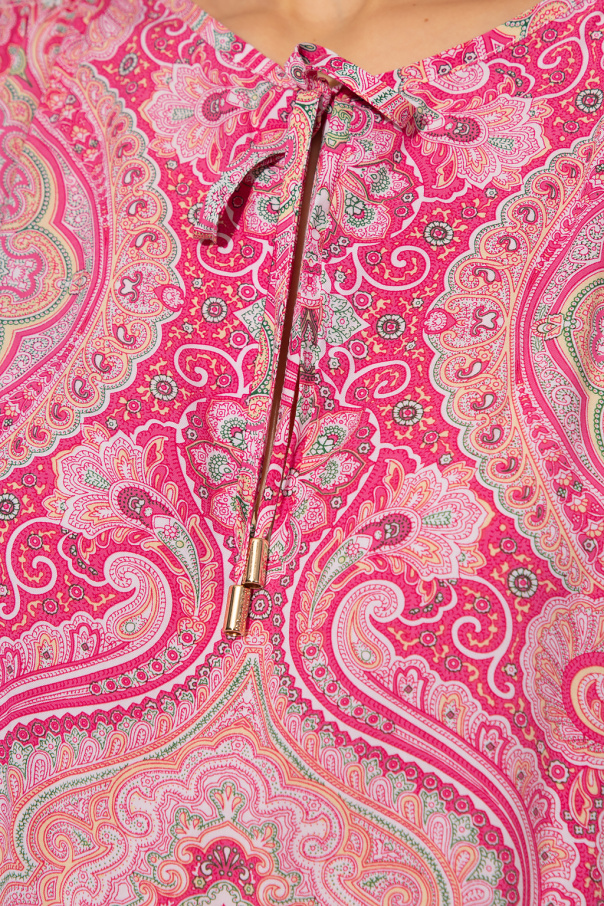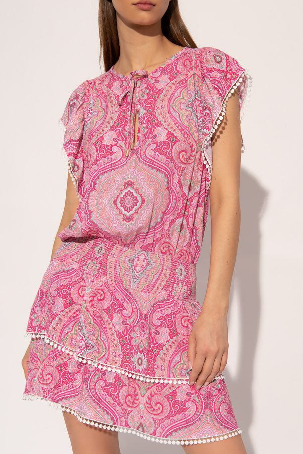 Pink ‘Keri’ mini beach dress from Melissa Odabash. Embellished with a colourful ‘Blush Paisley’ pattern, this style features a round neck with a drawstring split, short sleeves and ornamental white trims.