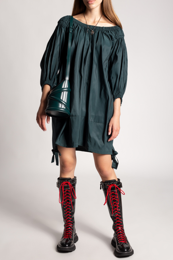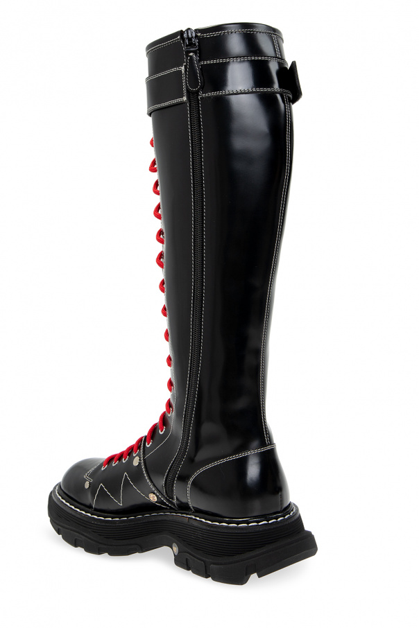 Black knee-high boots from Alexander McQueen. Made of calf leather, this lace-up model features a white stitching details, metal buckle, red lacing, lamb fur lining and black rubber sole.