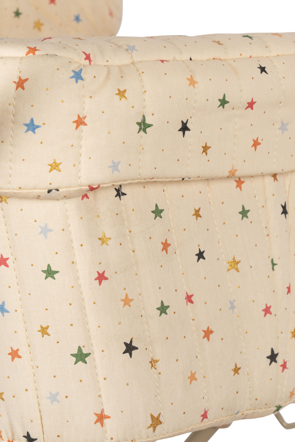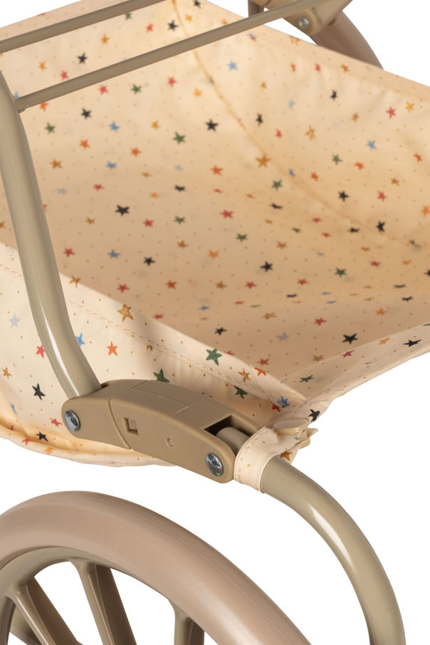 Introducing the exquisite Konges Sløjd Doll Stroller, a masterpiece of child\'s play, meticulously designed to rekindle the elegance of traditional baby carriages with a contemporary twist. This cream-colored marvel stands out with its classic, sophisticated design, reminiscent of the timeless charm and grace of yesteryear\'s prams. Constructed from the finest materials, the stroller features a plush, spacious bassinet made from 100% cotton, adorned with a delicate pattern of colorful stars spread evenly across the fabric, infusing it with a touch of whimsy. The bassinet\'s fabric is quilted, enhancing both durability and comfort, while the precise, parallel stitching speaks volumes of its superior craftsmanship. A coordinated button closure adds a functional yet chic detail, seamlessly integrating with the stroller\'s overall aesthetic. The frame, crafted from 100% iron, is painted to match the fabric, ensuring a cohesive and stylish look. The stroller\'s design is not only about aesthetics but also functionality, featuring an easy-to-use folding mechanism that makes it as practical as it is beautiful. Why Purchase This Product? Elegant and classic design that evokes the charm of traditional baby carriages High-quality materials including 100% cotton exterior and 100% polyester filling for comfort and durability Quilted fabric with colorful star pattern adds texture and visual appeal Easy folding mechanism for enhanced functionality Superior craftsmanship, evident in the careful stitching and coordinated details