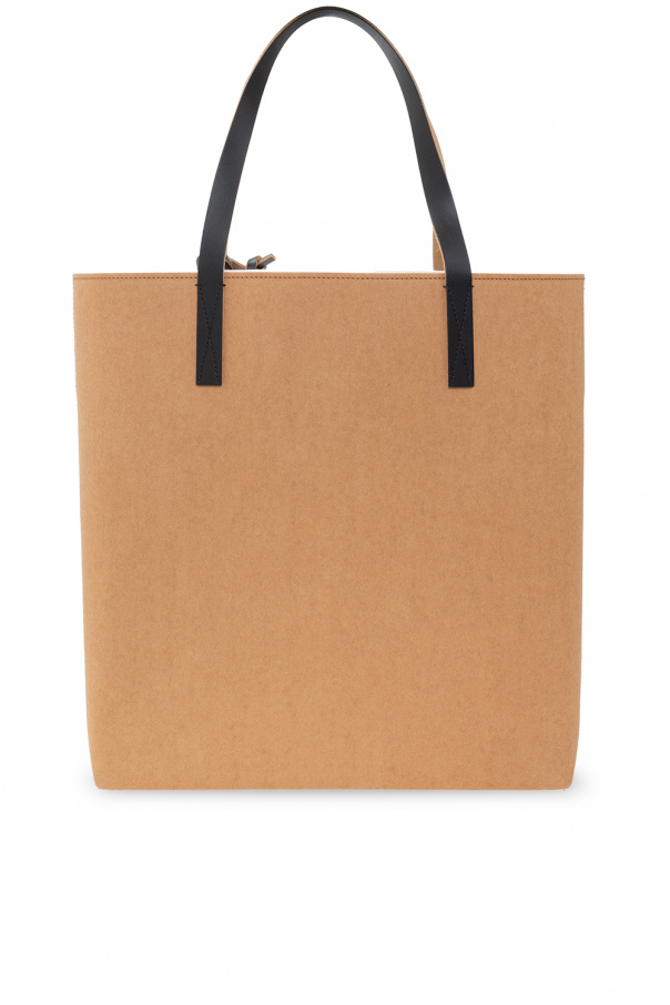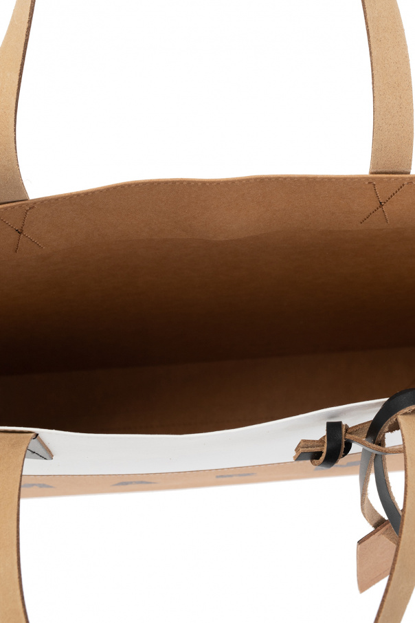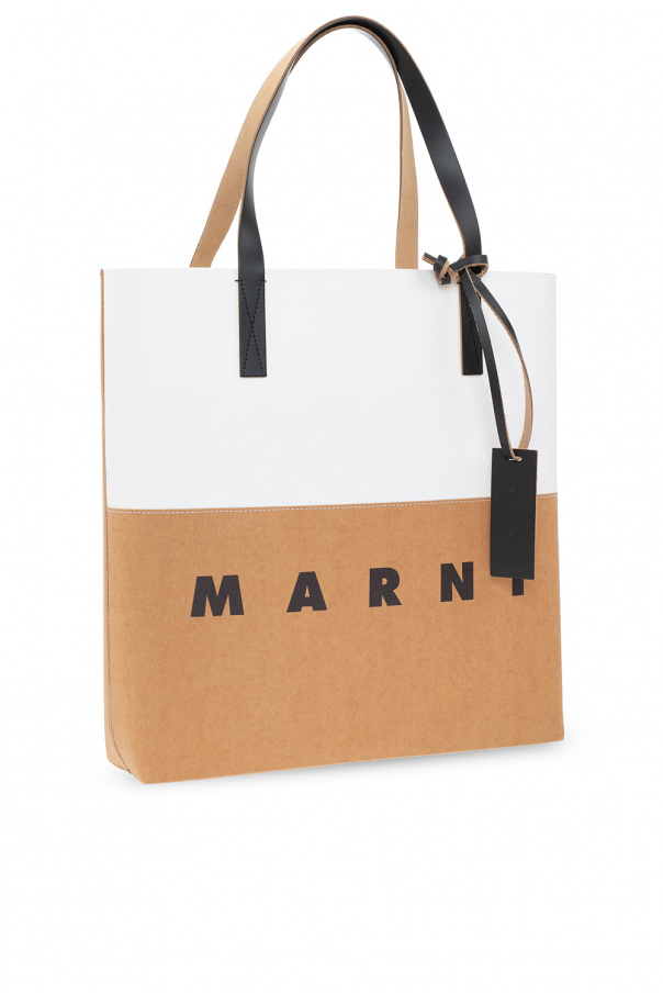 Brown, black and white shopper bag from Marni. Crafted from cellulose and finished with calf leather, this design features a black graphic logo print on the front, two half-round handles, a decorative leather logo tag and one internal compartment.