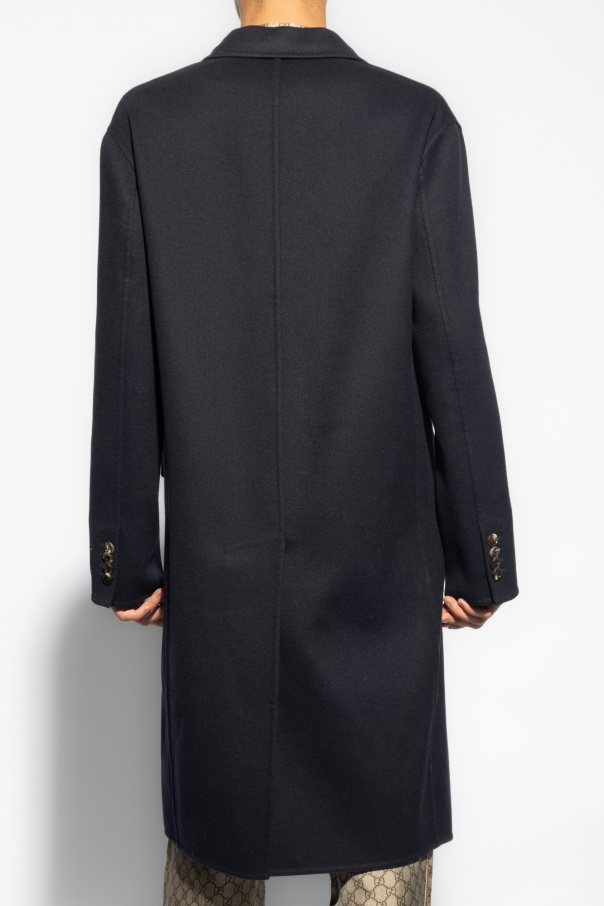 Navy single-breasted coat from Gucci. Made from a wool and cashmere blend, this garment features buttons, notch lapels, two flap pockets, one slip pocket, single rear vent and long sleeves with buttoned cuffs.