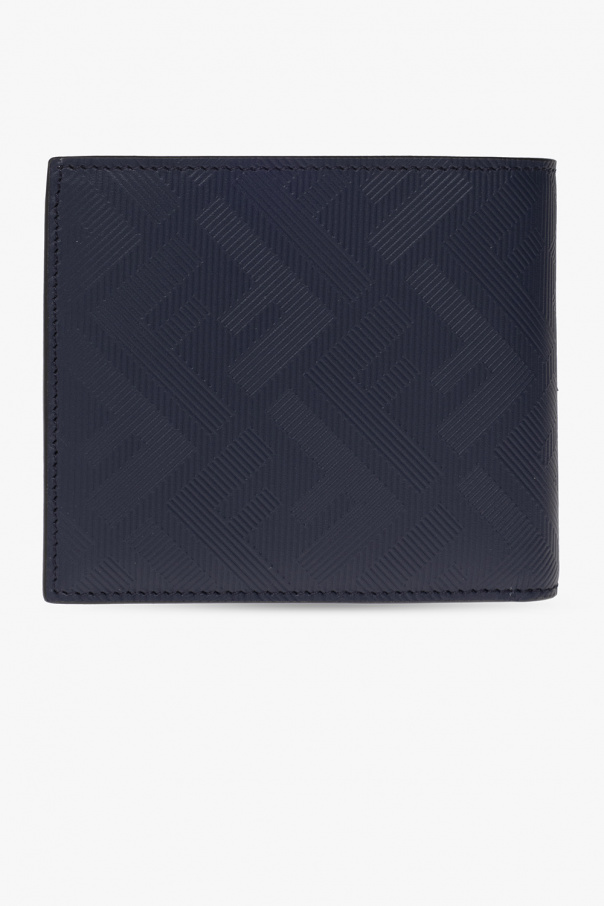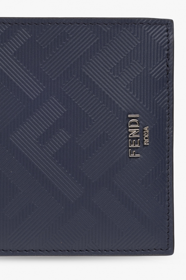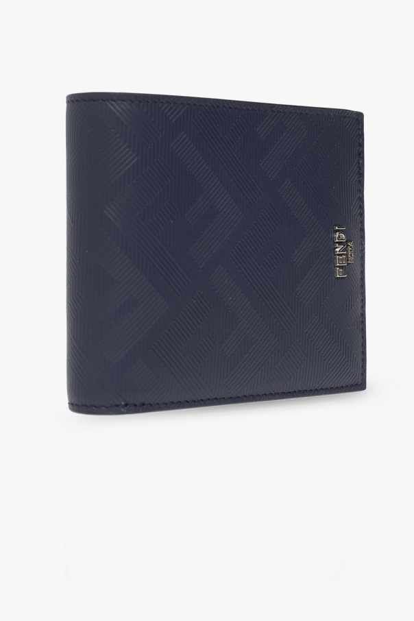 Navy bifold wallet from Fendi. Made of calf leather with an embossed monogram pattern, this item features a silver-tone metal logo appliqué. It has a bill compartment, two slip pockets and eight card slots inside.