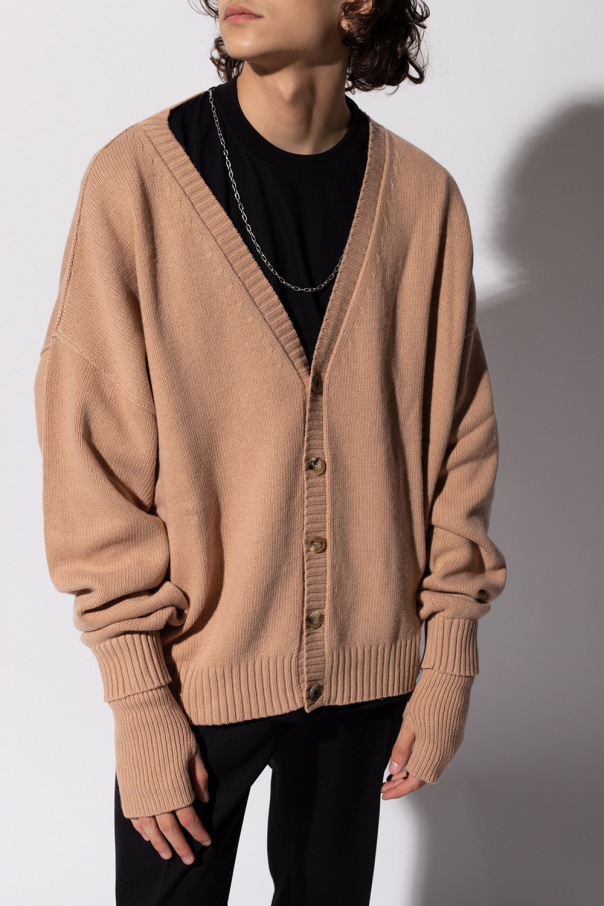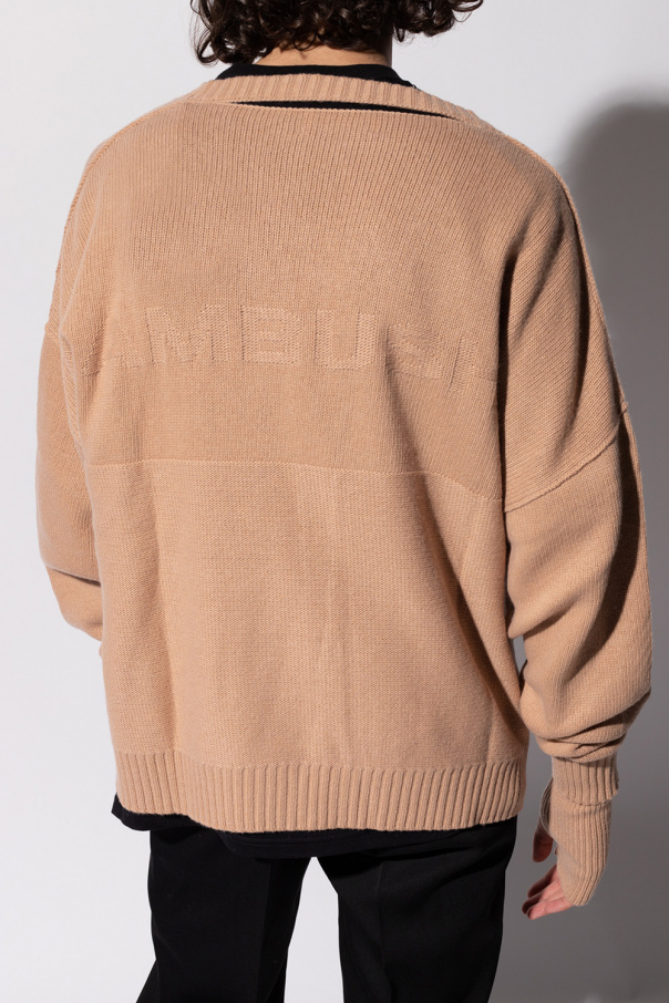 Beige cardigan from Ambush. Crafted from a wool and cashmere blend, this style fastens via buttons and features a V-shaped neckline, a ribbed bottom hem and cuffs and an embroidered logo on the back.