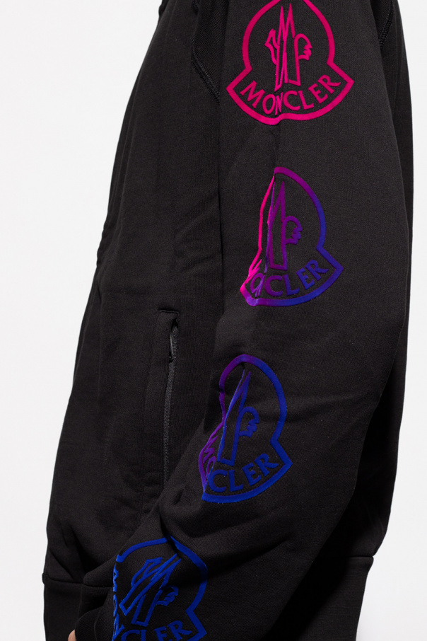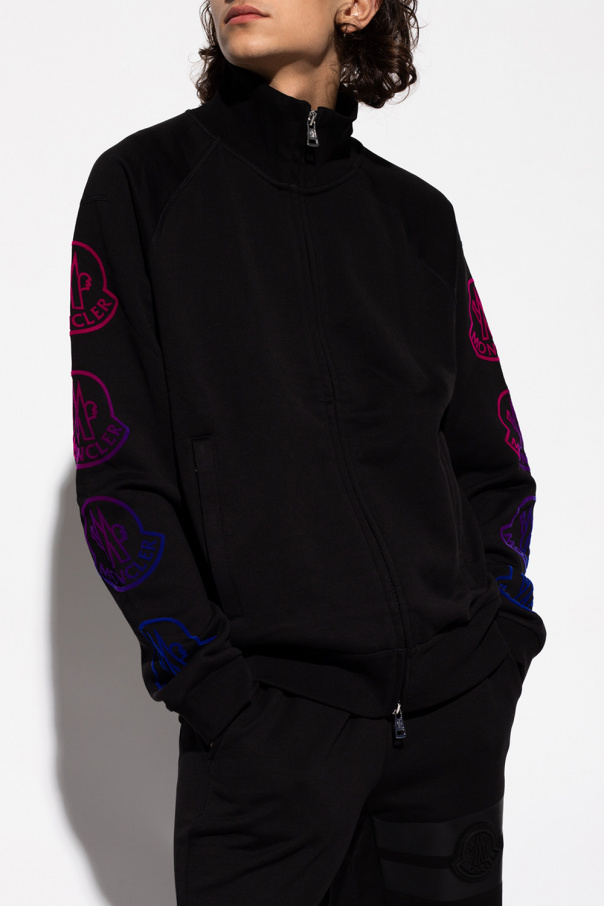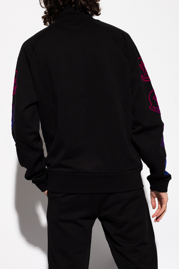 Black sweatshirt with a stand-up collar from Moncler. Fastened with a two-way zip, this cotton-made garment features velvet logo appliqués in pink, purple and navy, two front slip pockets and ribbed trims at the hem and cuffs.