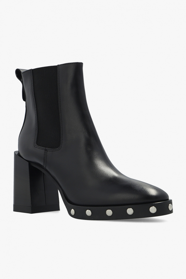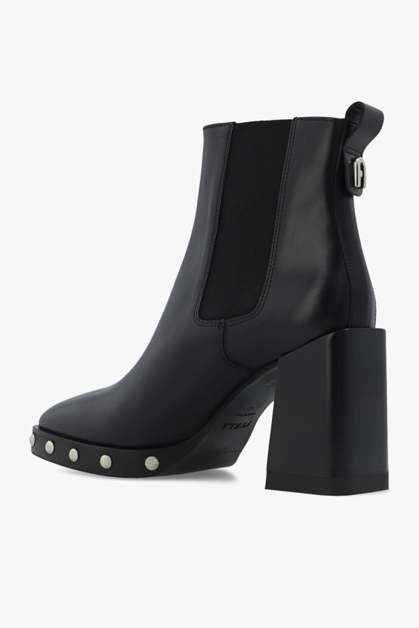 Black ‘Greta’ ankle boots from Furla. Crafted from leather and embellished with silver-tone studs, this model sits on a black rubber sole and features elastic panels on the sides and logo detailing.