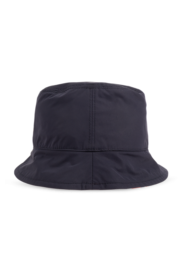 Reversible bucket hat from Moncler. One side is navy blue, the other side showcases a red, white and navy blue monogram.
