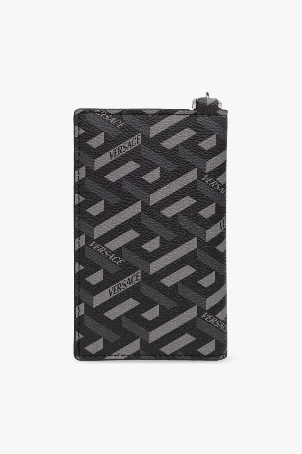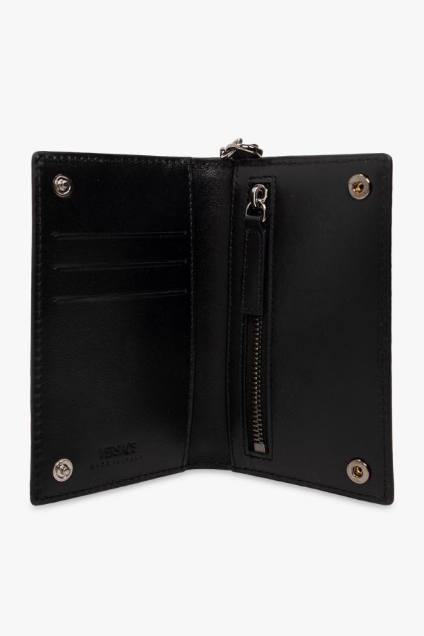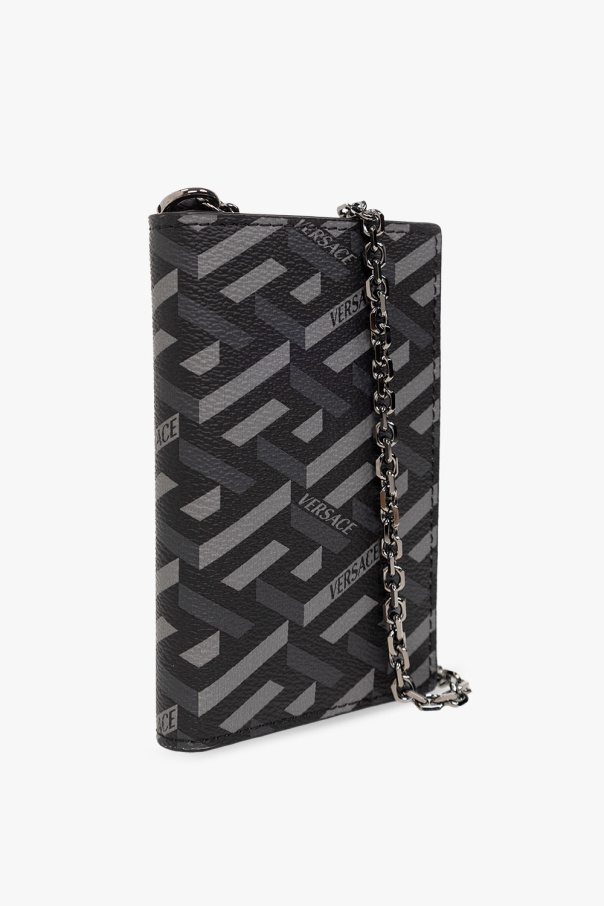 Black and grey folding wallet from Versace. Crafted from faux leather with the brand\'s ‘La Greca’ pattern, this design features snap closures, a detachable chain strap in dark silver-tone, and two slip pockets, one zip pocket and three card slots inside.