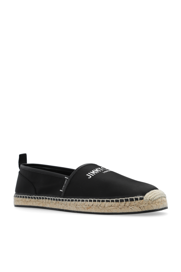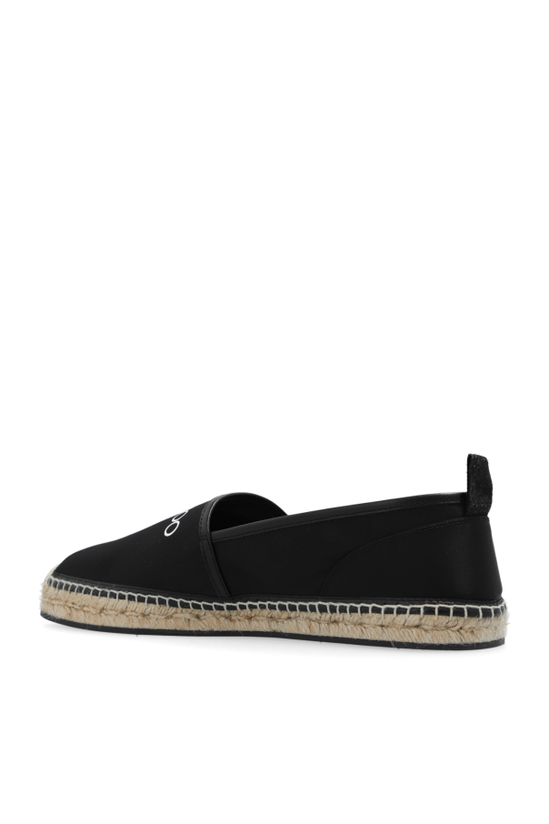 Black ‘Egon’ espadrilles from Jimmy Choo. Made from fabric and trimmed with leather, this model sits on a beige woven jute sole with black rubber trim and showcases a printed white logo.