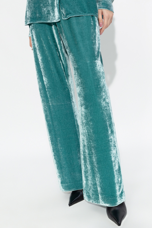 Green trousers from JIL SANDER. Made of velour, this flared design fastens with a hidden side zip and hook to the side.