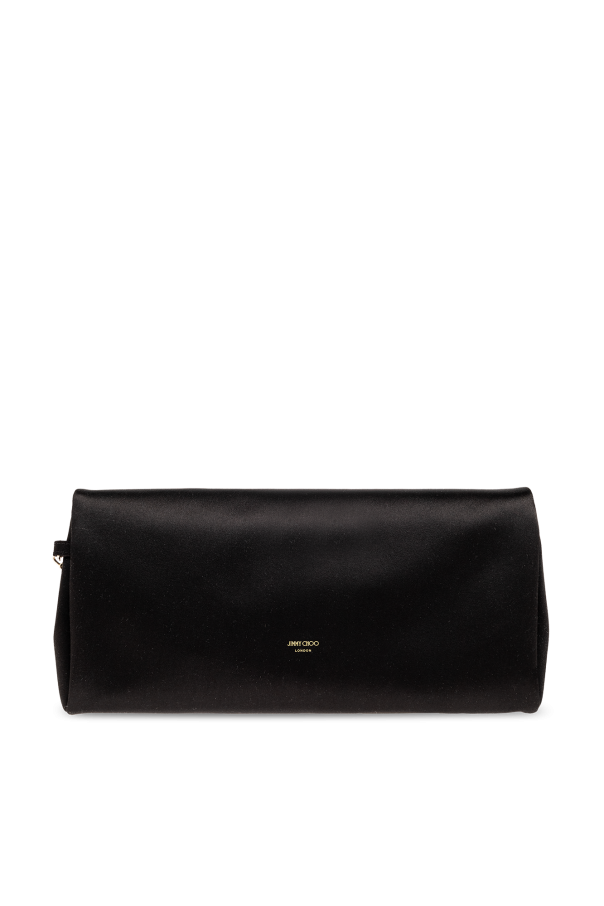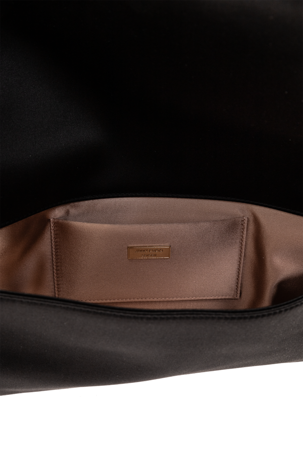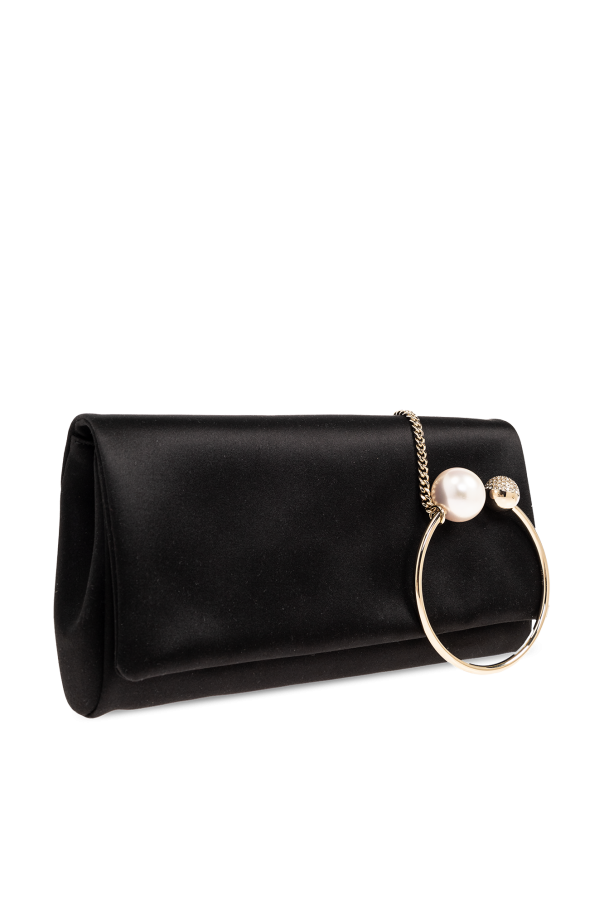 Black ‘Xandra’ clutch from Jimmy Choo. Rendered in satin, this design secures via magnetic closures and showcases a distinctive chain handle with an engraved logo, sparkling crystals and a pearl. It is complete with gold-tone metal hardware and one internal compartment with a card slot.
