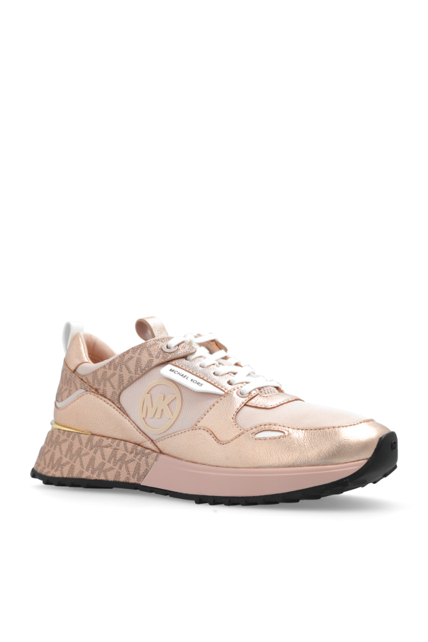 Pink ‘Theo’ sneakers with a metallic finish from Michael Michael Kors. Made of leather, fabric and monogram canvas, this lace-up pair features a logo and a black and pink sole with a gold-tone insert.