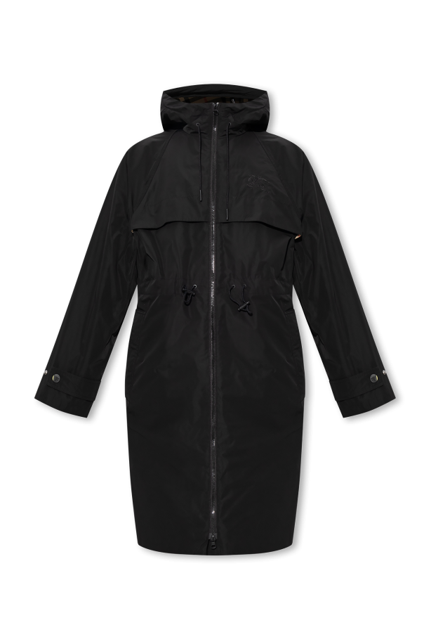 Black ‘Charminster’ coat from Burberry. Crafted with a relaxed fit, this style fastens with a two-way zipper and snaps and features a drawcord-adjustable hood and waist, two front zip pockets, long sleeves, logo embroidery and a beige lining flaunting the brand\'s signature colourful check pattern.