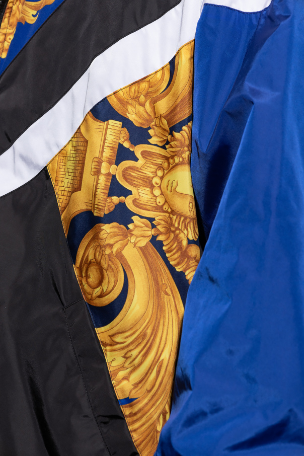 Black, navy blue and white track jacket with a standing collar from Versace. Embellished with an orange ‘Barocco 660’ print, this style features a zip fastening, two snap-fastened pockets, long sleeves and a drawcord-adjustable hem.