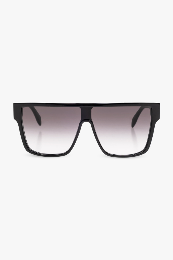Black sunglasses from Alexander McQueen. Made of acetate, this model features silver-tone logo detailing on the temples and grey gradient lenses with 100% UV protection. Case included.
