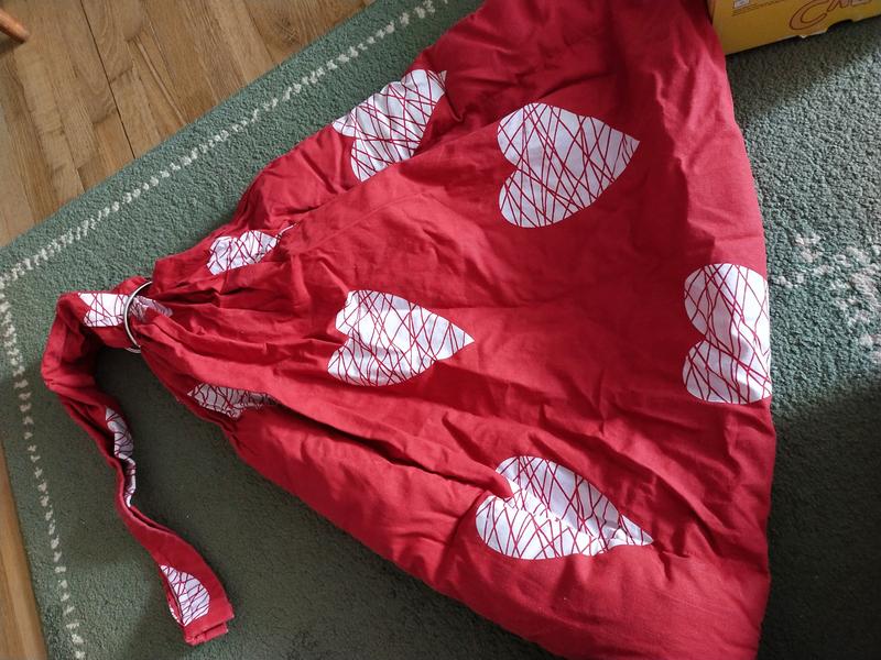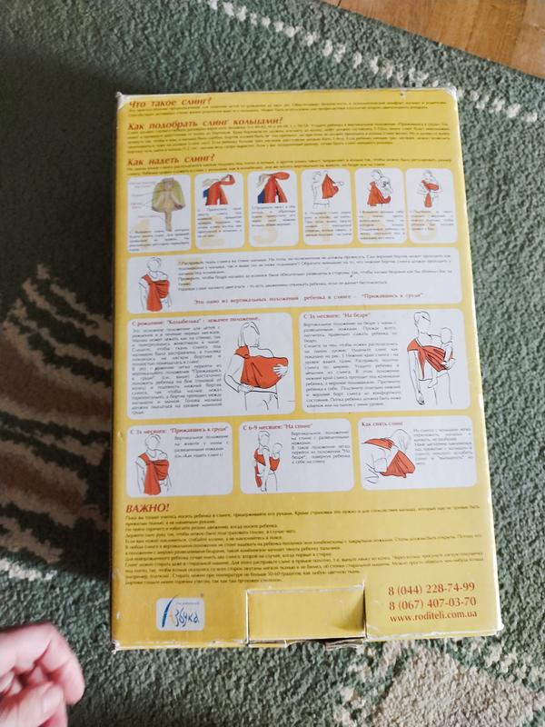 Слинг на кольцах, есть коробка с инструкцией взади, как носить ребенка, от стирки чуточку ткань побелела у колец, но все целое.