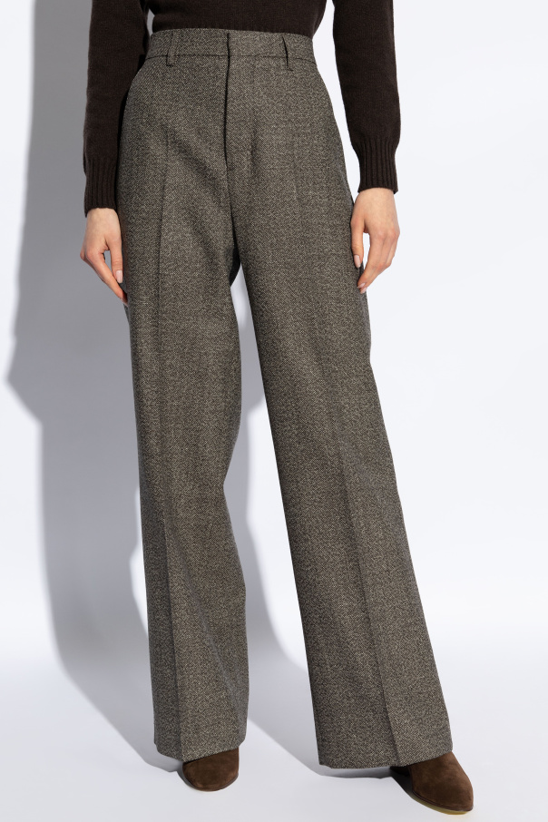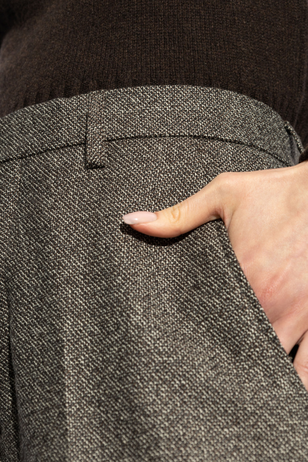 Introducing the quintessence of sartorial elegance: Ami Alexandre Mattiussi\'s Pleated Trousers. Crafted with an exquisite blend of wool and cotton, these trousers exemplify the pinnacle of luxury and comfort. The dominant dark brown hue, interwoven with subtle black and cream accents, presents a sophisticated palette that enriches its classic, straight silhouette. The trousers boast a seamless front and crisp pleats, encapsulating a minimalist yet profoundly elegant aesthetic. This design, devoid of front pockets, accentuates a clean line, while the inclusion of discreet back pockets ensures functionality without disrupting its sleek profile. A high-rise waist, currently at the forefront of fashion trends, offers both a flattering fit and a nod to contemporary style sensibilities. Secured by a zipper, hook, and button closure, these trousers promise both security and ease of wear. Displayed on a model, the trousers\' impeccable drape and the impression they make can be fully appreciated. Though styled with complementary pieces like a sweater and blazer for visualisation, the trousers stand as a testament to refined taste and understated luxury on their own. Why Choose These Trousers? Timeless Elegance: Classic pleated design with a modern high waist. Luxurious Material: Premium blend of wool and cotton for ultimate comfort and durability. Versatile Styling: Suitable for formal and business settings, adaptable to various wardrobe ensembles. Subtle Detailing: Elegant brown with a delicate pattern, elevating the aesthetic appeal. Exemplary Craftsmanship: From the renowned designer Ami Alexandre Mattiussi, a guarantee of quality and style.