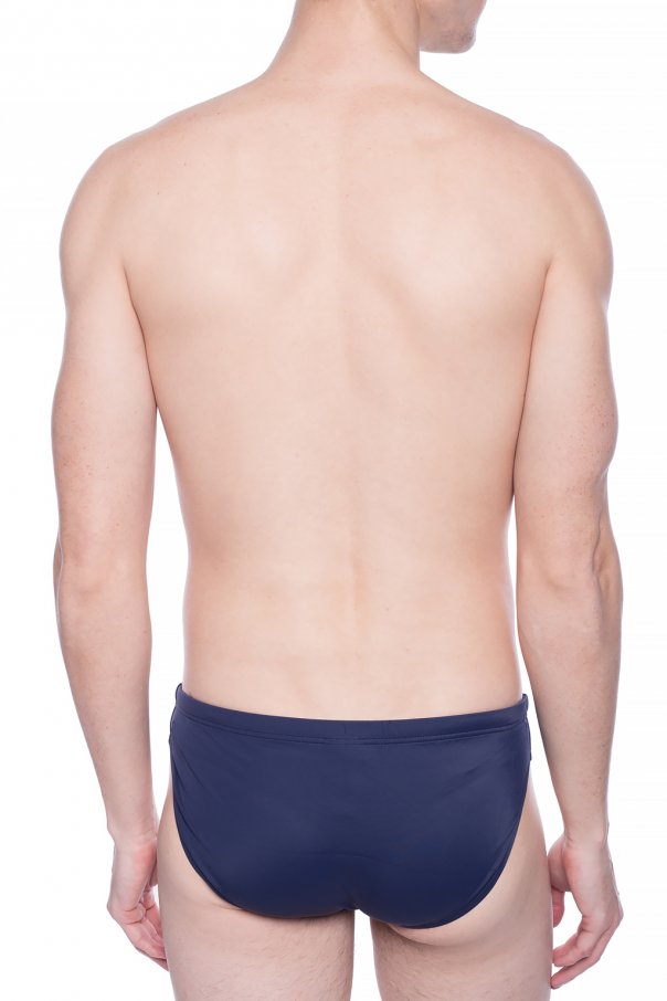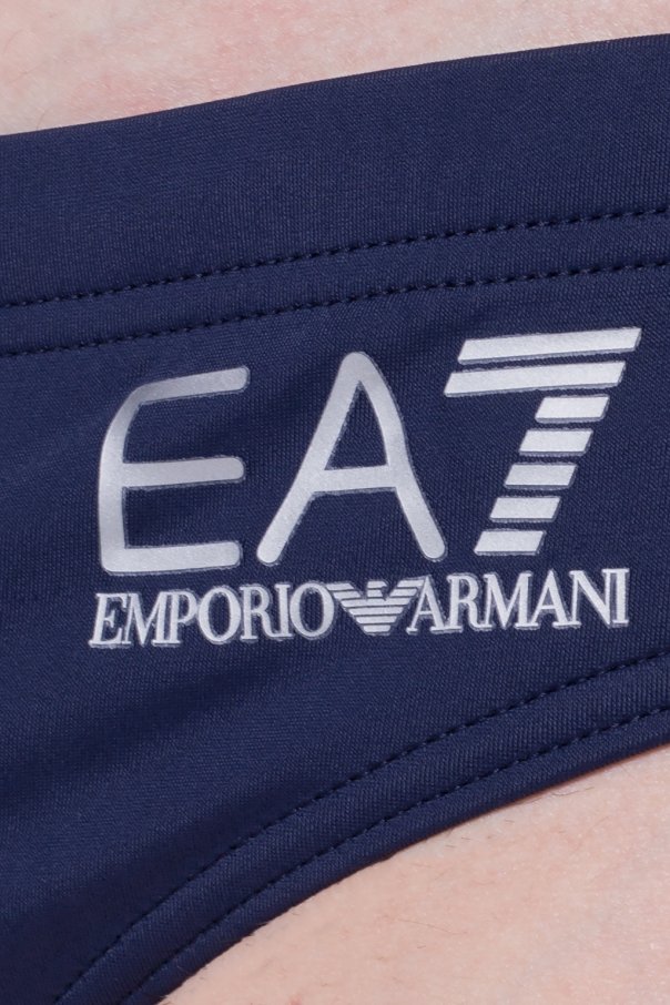 Navy swim shorts from EA7 Emporio Armani. Drawstring fastening. Decorated with a silver-tone logo print.