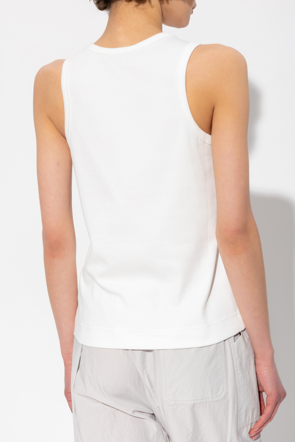White tank top with a round neck and black logo print from Moncler. Made of cotton.