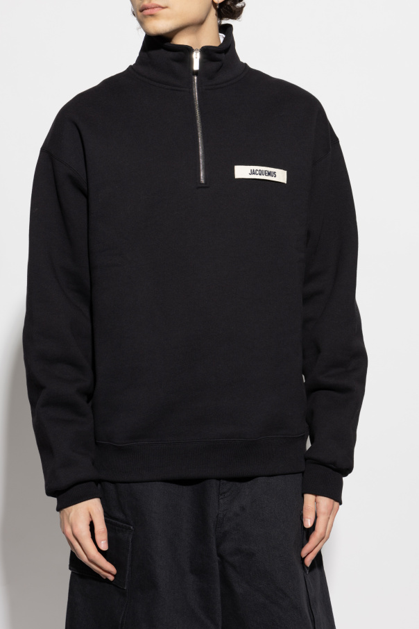 Introducing the Bluza z logo, an epitome of refined elegance from the exclusive collection by Jacquemus. This men\'s black sweatshirt embodies a minimalist aesthetic, expertly crafted from premium cotton. Its classic, straight silhouette with long sleeves is accentuated by a sleek half-zip turtleneck, infusing modern sophistication into your wardrobe. The unembellished design, featuring a subtle \"JACQUEMUS\" patch on the chest, speaks volumes of understated luxury, making it a versatile piece for casual outings. Perfectly paired with shorts and black shoes, it exudes a relaxed, yet stylish vibe, ideal for cooler days. Why Choose This Product? Exquisite Design: Classic cut with a modern twist. Premium Material: Made from high-quality cotton. Brand Signature: Features the iconic Jacquemus logo. Versatile Styling: Perfect for both casual and sophisticated looks.