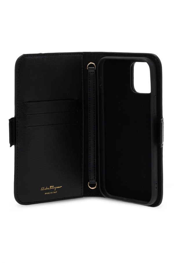 Black bifold iPhone 11 case from Salvatore Ferragamo. Crafted from calf leather, this item has a magnetic snap fastening, grosgrain Vara bow with a logo-embossed appliqué in gold-tone, detachable strap with chain inserts and four card slots.