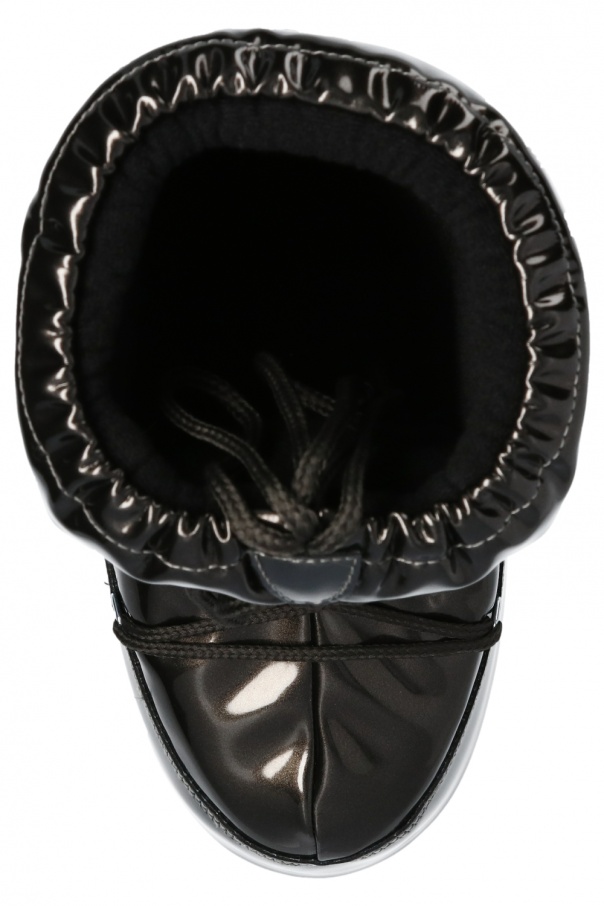 Black ‘Vinile Met’ lace-up snow boots from Moon Boot. This high-top design features a logo print, metallic finish, silver-tone metal hardware and a rubber sole in beige and black. Inspired by the peculiar shape and technology of the astronauts’ boots, the iconic style was designed in 1969 after the first Moon landing.
