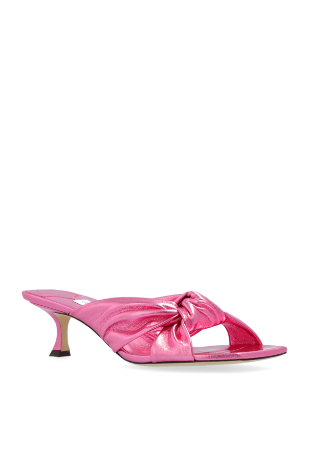 Pink ‘Avenue’ mules from Jimmy Choo. Made from metallic leather with a square toe, this model sits on a beige leather sole and features a decorative knot on the front.