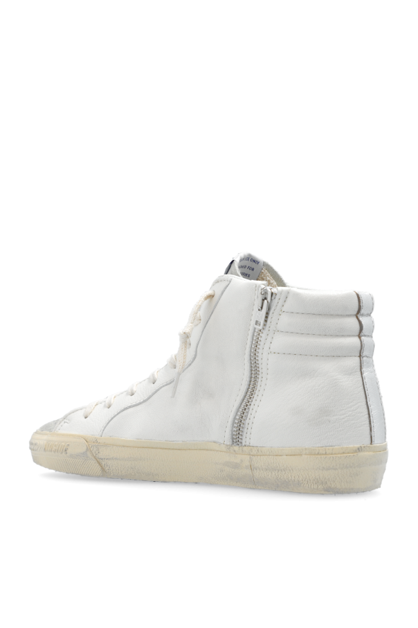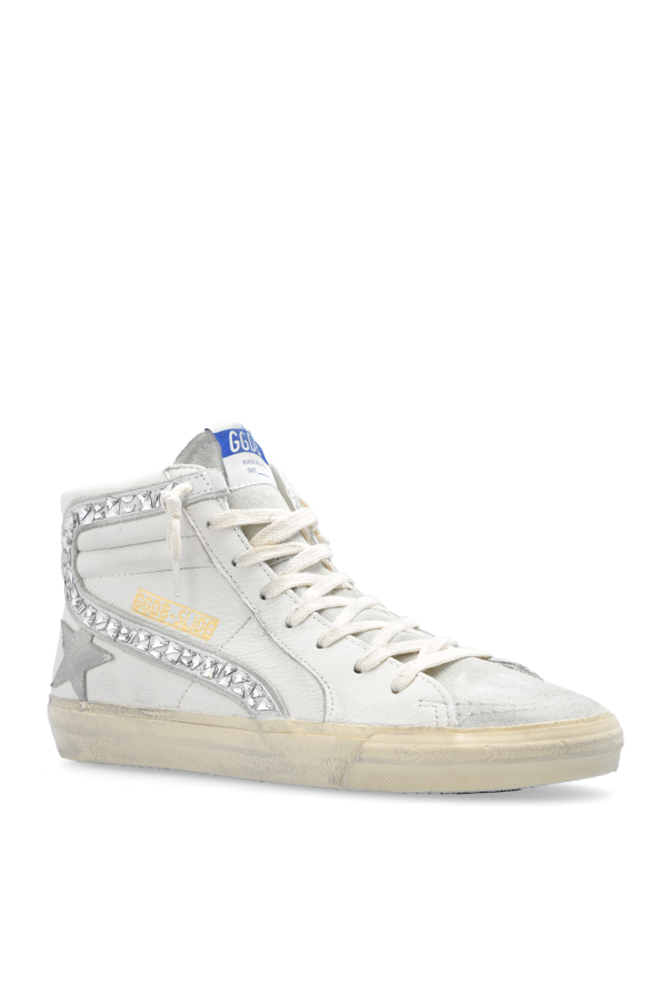 Introducing the \'Slide Classic\' sneakers by Golden Goose, a masterpiece that embodies the quintessence of luxurious athleticism. Crafted with a meticulous eye for detail, these high-top sneakers feature a pristine white base complemented by subtle grey accents and golden logo inscriptions, presenting a harmonious blend of elegance and sportiness. The exterior of these distinguished sneakers is adorned with a large grey star, a signature emblem of the brand, and embellished with delicate chains or crystals along the lace guard and edges, infusing an air of exclusivity. The classic white laces and the vintage-styled rubber sole, slightly aged for a touch of nostalgia, further accentuate their unique appeal. The sneaker’s tongue proudly displays the model name \'SLIDE\' and the brand’s logo in a striking blue, while the interior boasts a plush lining and a branded insole, ensuring comfort without compromising on style. Why Purchase These Sneakers? Iconic Design: Recognizable grey star and golden logo epitomize the designer\'s signature aesthetic. Exquisite Details: Embellishments of chains or crystals offer a luxurious touch. Superior Comfort: High-quality leather and fabric materials, combined with a cushioned interior, provide unparalleled comfort and durability. Easy Wearability: The blue loop at the heel ensures effortless slipping on and off. Vintage Charm: The lightly aged rubber sole adds a vintage appeal to these contemporary sneakers.