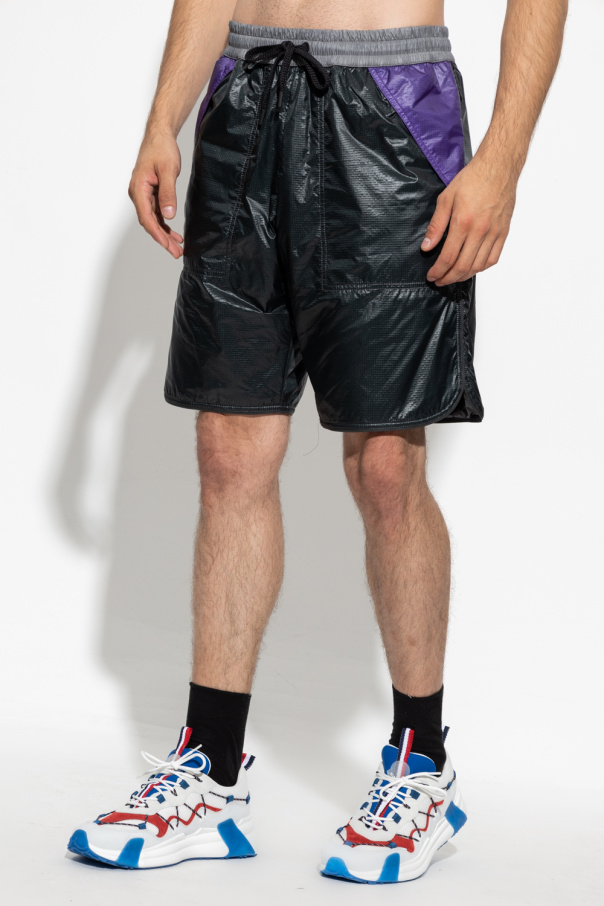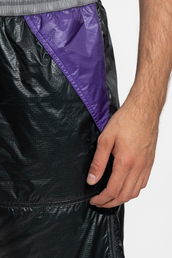 Black, grey and purple shorts from Moncler Grenoble, the ’Moncler Grenoble Day-Namic’ collection. Made of nylon ripstop fabric with Polartec® Alpha® Direct insulation which regulates heat and provides increased breathability. It is complete with an elastic waistband with drawstrings, black logo appliqué, reflective print and trimming as well as two slip pockets.