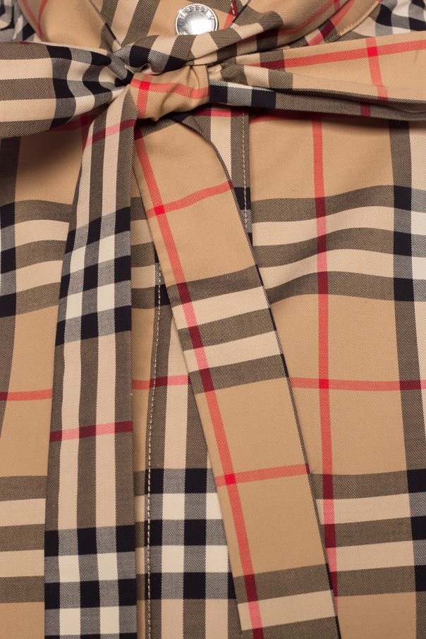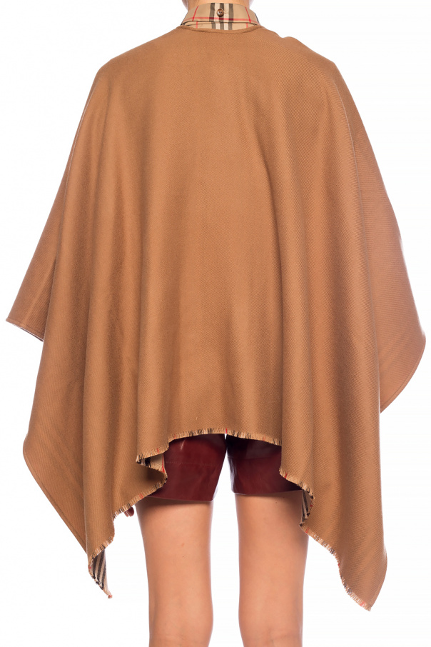 Brown poncho from Burberry. Made of wool. Decorated with short fringes. Lining decorated with the brand’s signature check pattern in black, cream and red.