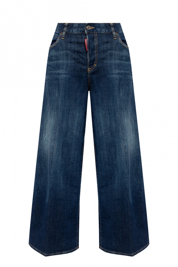 Blue ‘Page Jean’ jeans from Dsquared2. Made of stretch cotton, this pair fastens via buttons and employs five pockets, brown patch with printed red D2 logo on the back and straight, wide legs.