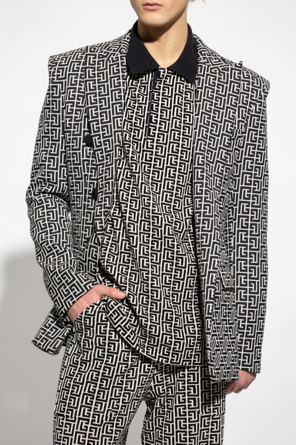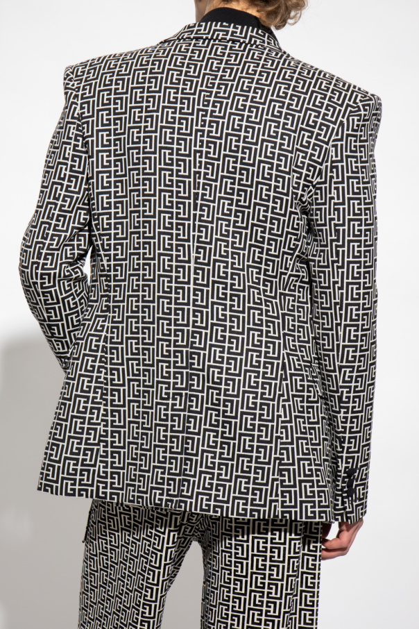 Cream and black loose-fitting blazer from Balmain. Made of virgin wool, this model features decorative buttons, a monogram, peak lapels, two flap pockets, one slip pocket, single rear vent and long sleeves with buttoned cuffs.