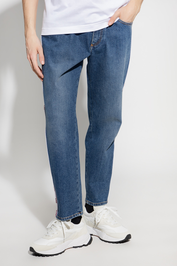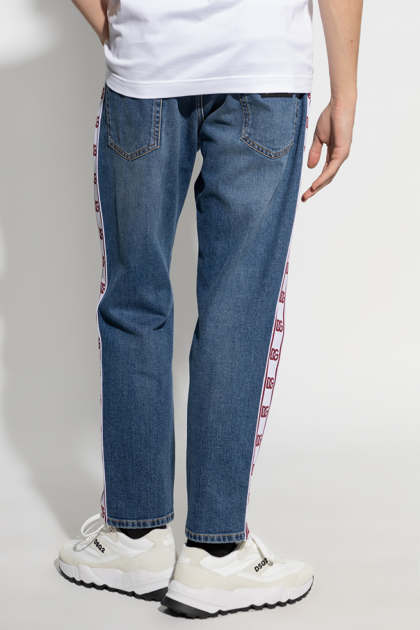 Blue and maroon jeans from Dolce & Gabbana. Emblazoned with a patch and logo appliqué, this pair falls with slightly tapered legs and features a vintage effect, a zip fly, a drawstring waist, classic five pockets and white and maroon side panels with an embroidered logo.