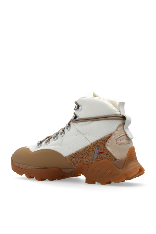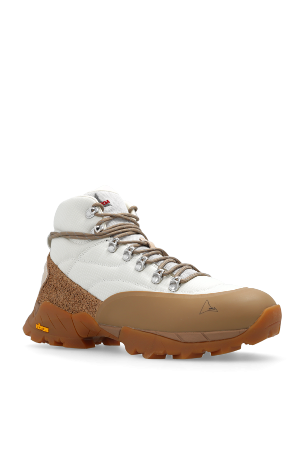 Cream and brown ‘Andreas’ hiking boots from ROA. Crafted from fabric with rubber trims, this lace-up pair is decorated with a logo and set on a brown Vibram® Megagrip toothed tread pattern sole for optimal traction and use on the roughest surfaces.