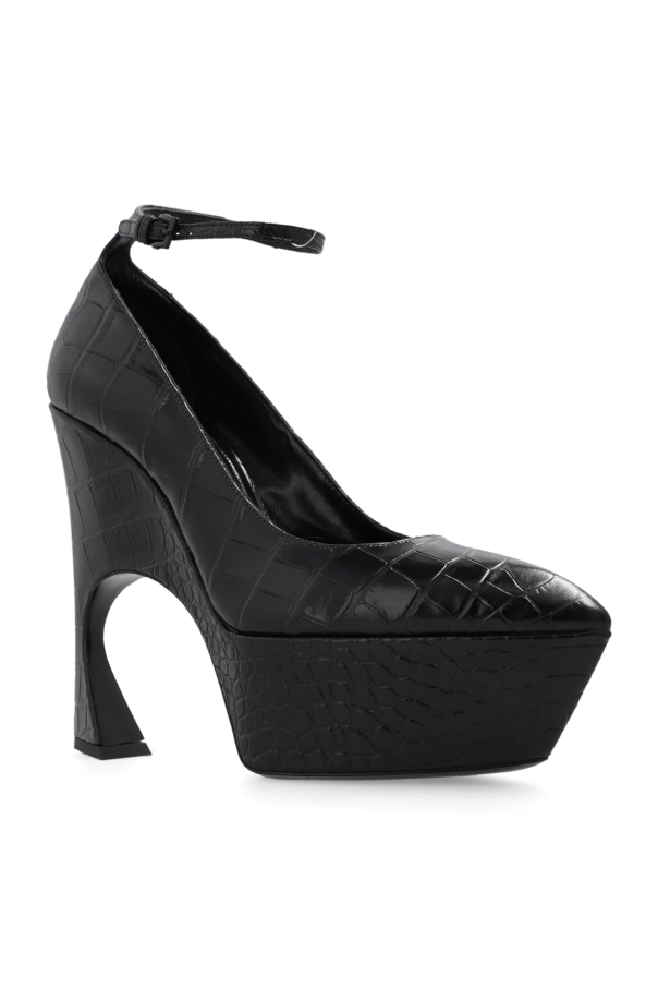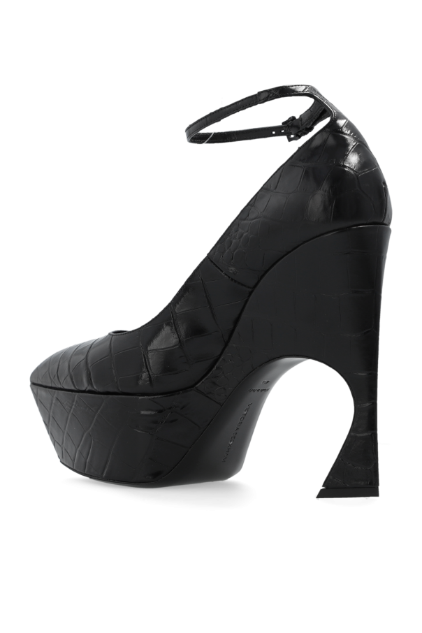 Black platform pumps from Victoria Beckham. Made of calf leather with a crocodile skin effect, this model sits on a black leather sole and features a pointed-toe silhouette and an adjustable buckle strap around the ankle.