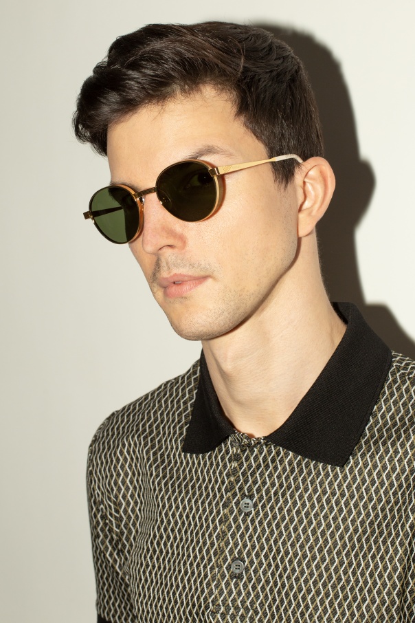 Gold-tone sunglasses from Gucci. This model features an embossed logo and cream elements at the temples as well as black lenses with 100% UVA/UVB protection.