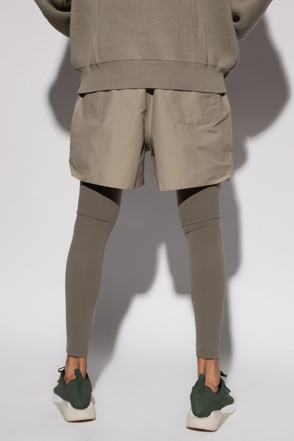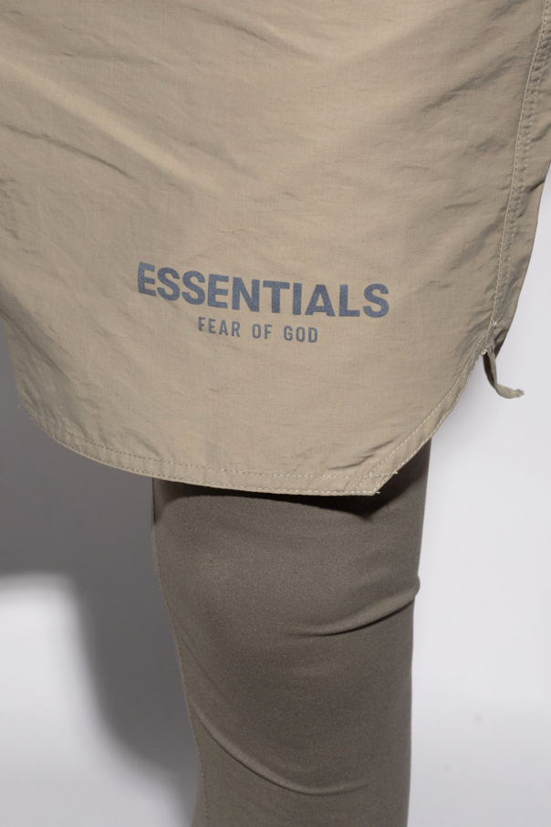 Gray leggings from Fear Of God Essentials. This pair features an elastic waistband in black and is decorated with a reflective logo in silver-tone.