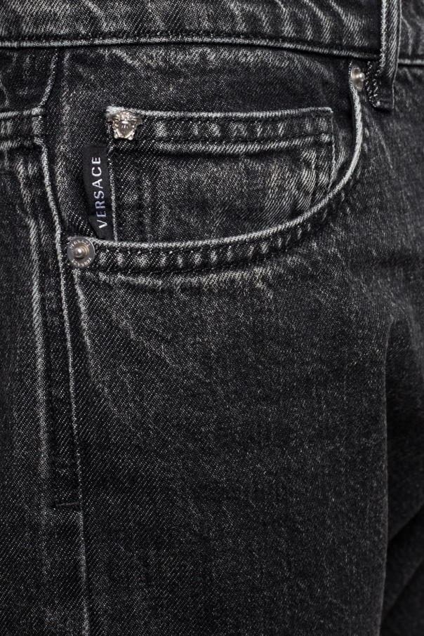 Grey distressed jeans from Versace. Zip and button fastening. Decorated with a brown patch and the brand’s signature Medusa head motif. 3 slip pockets on the front, two at the back. Straight legs.