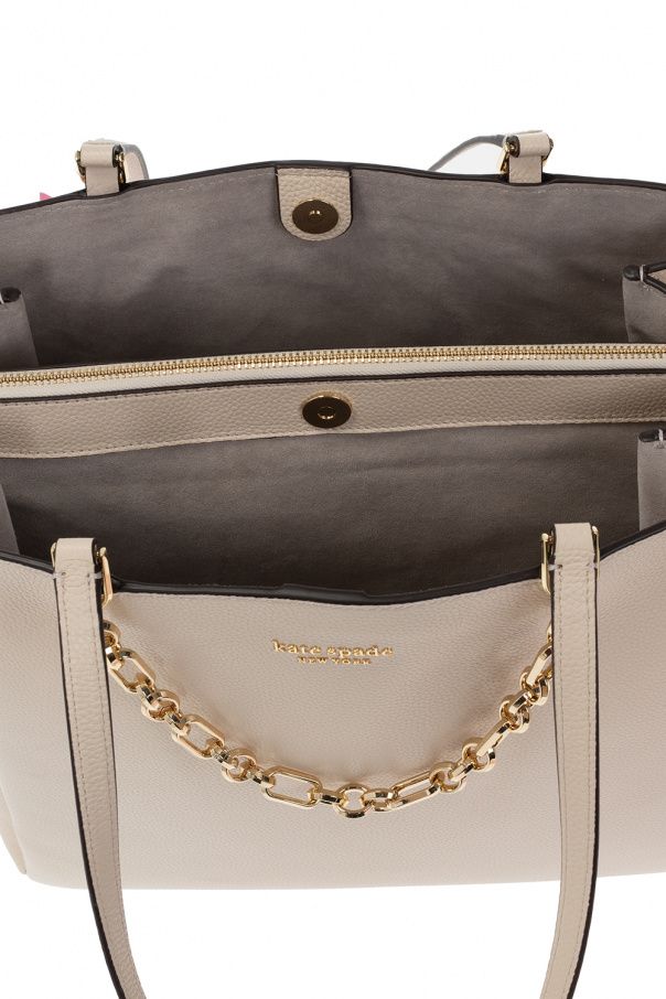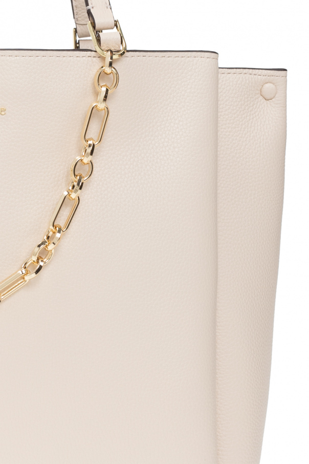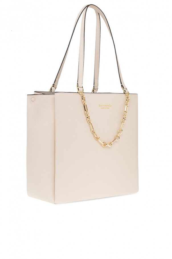 Cream ‘Knott Large’ handbag from Kate Spade. Crafted from grained leather, this model features a snap hook, logo appliqué, drawstrings on the sides, two half-round handles, gold-tone metal hardware and one internal compartment with grey lining, one zip pocket and one snap-fastened pocket.